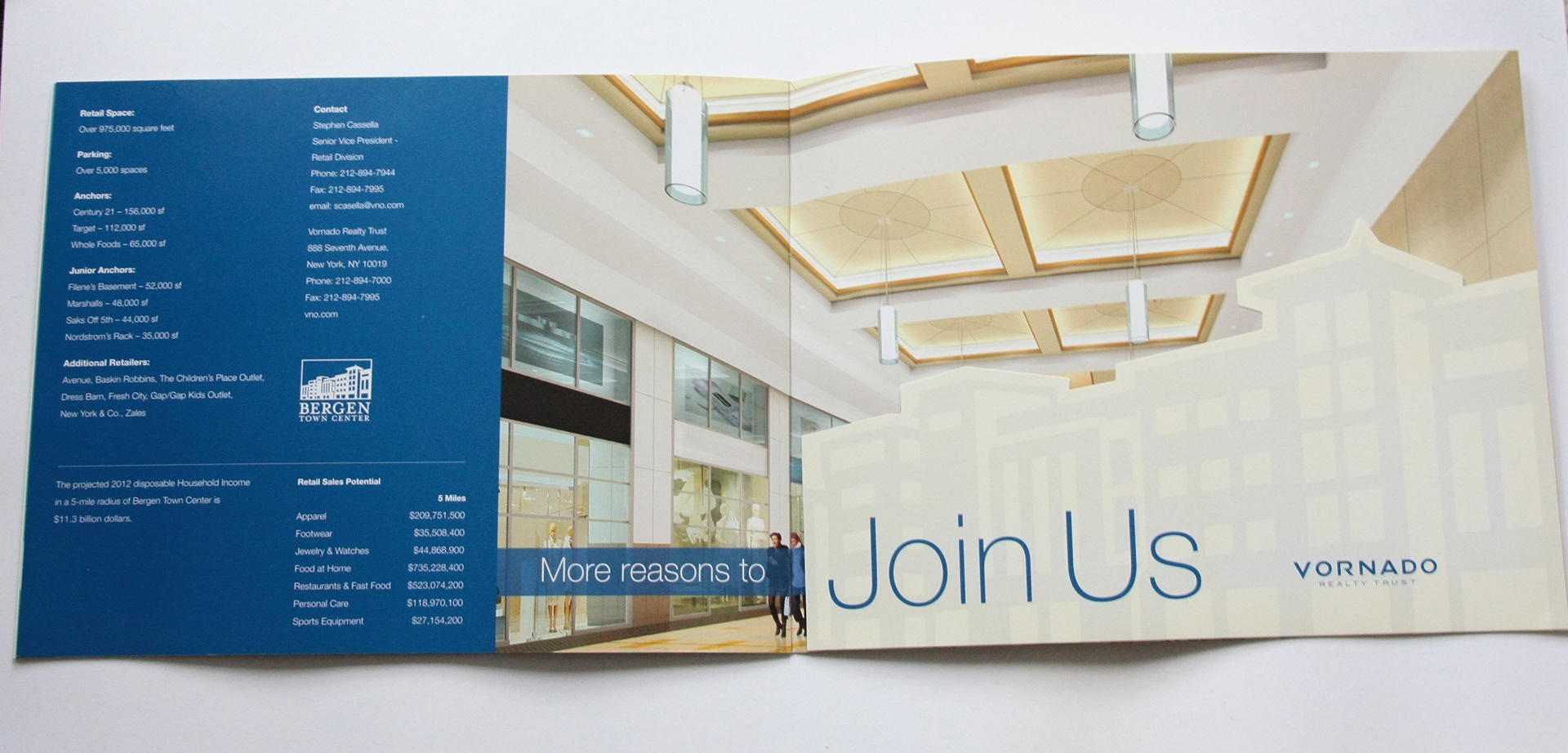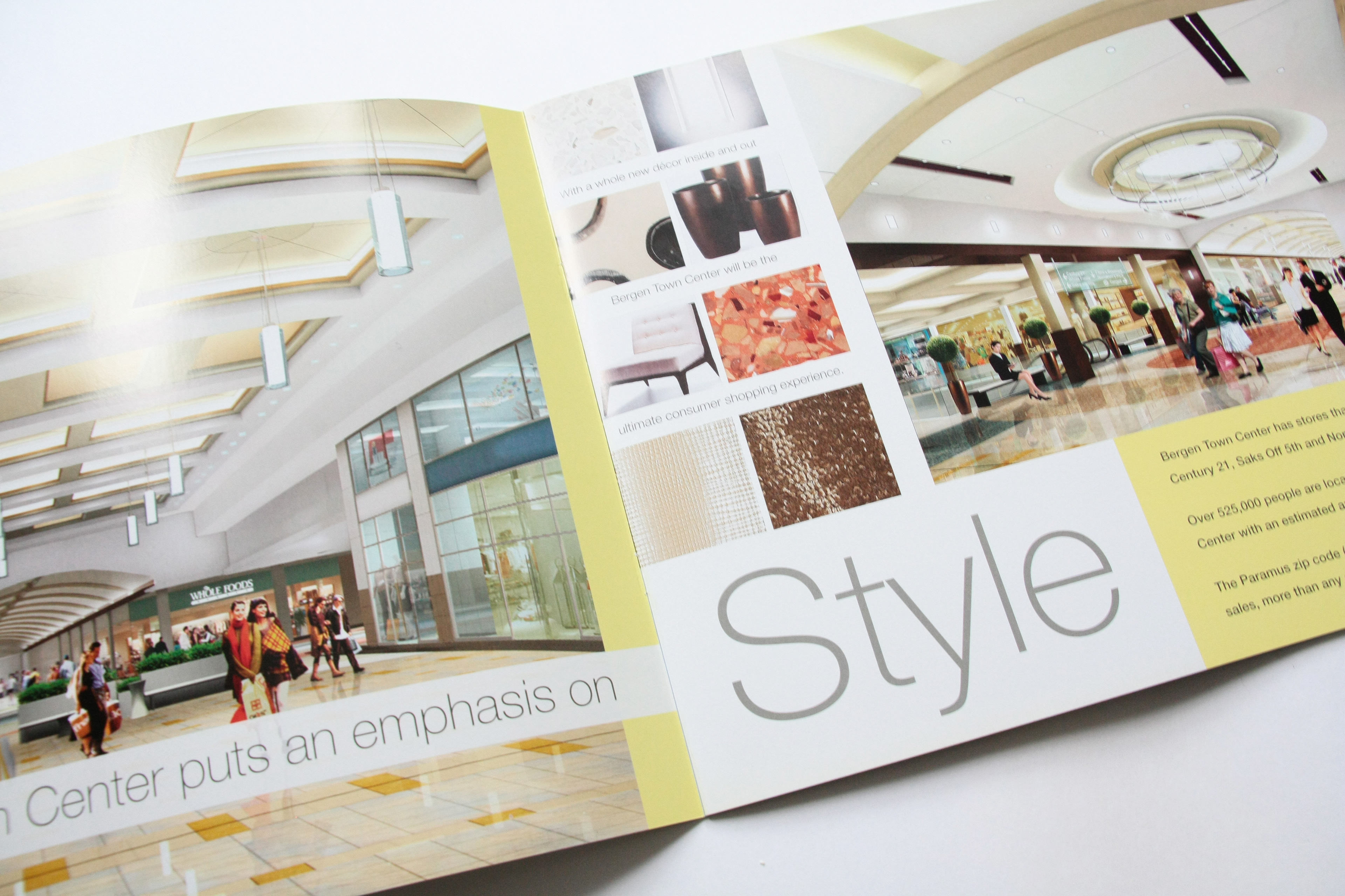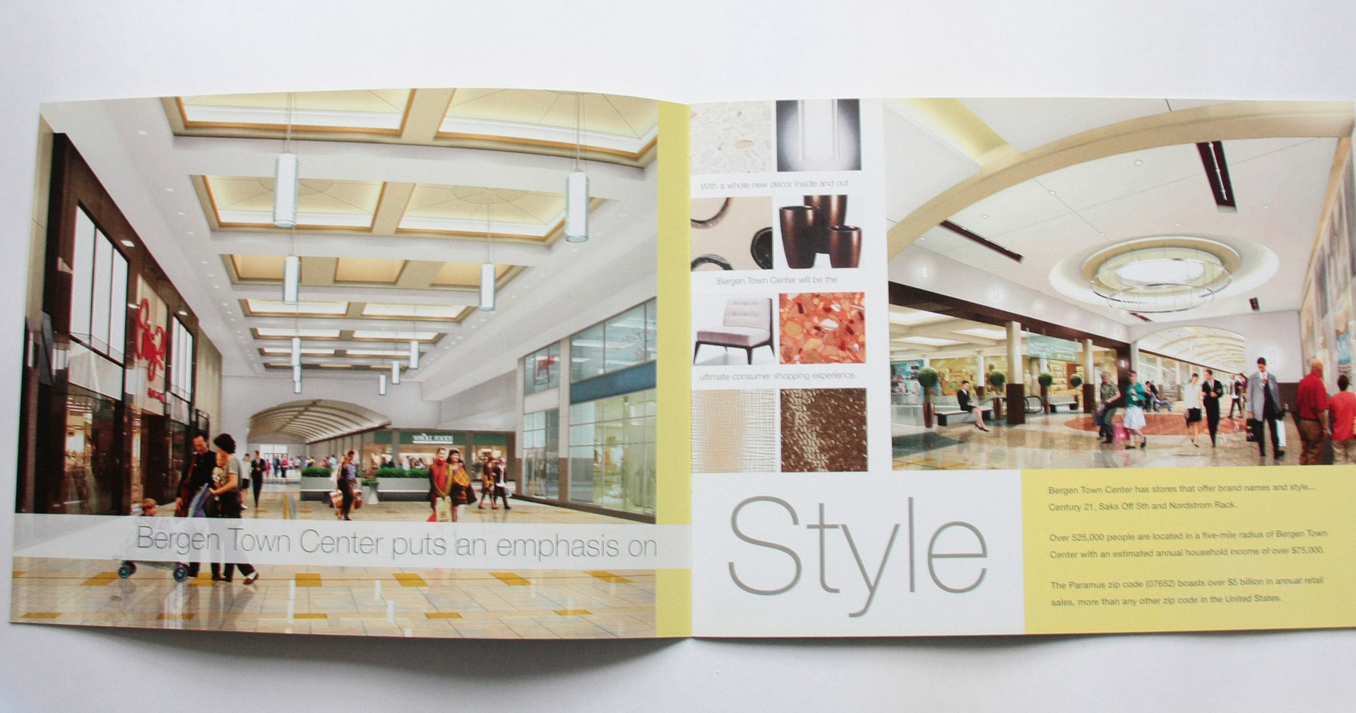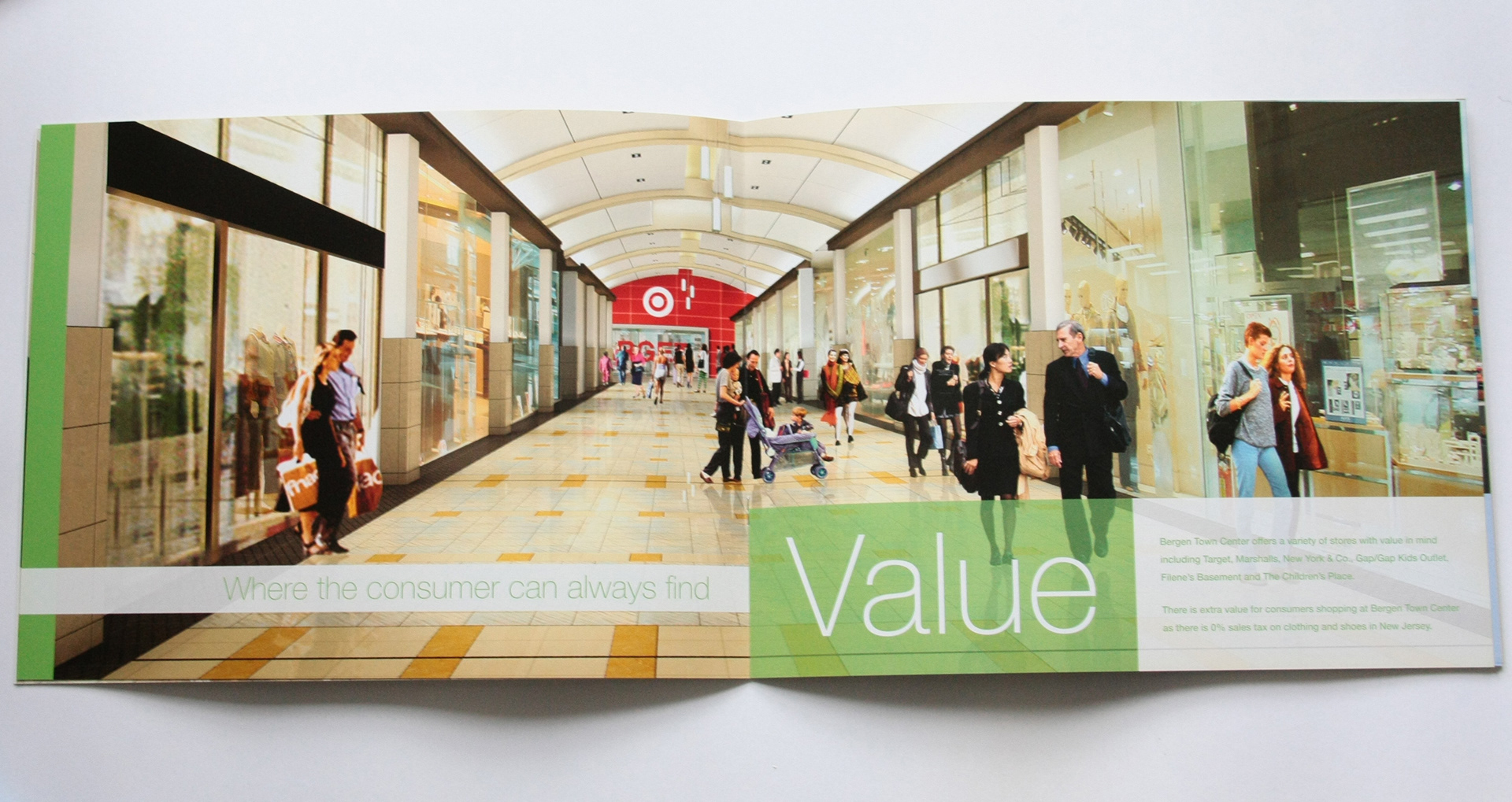 this is a brochure for bergen town center, a high-end outlet mall in paramus, nj. the client is vornado, a large nyc real estate developer. the goal was to attract high-end retailers to a newly renovated building.